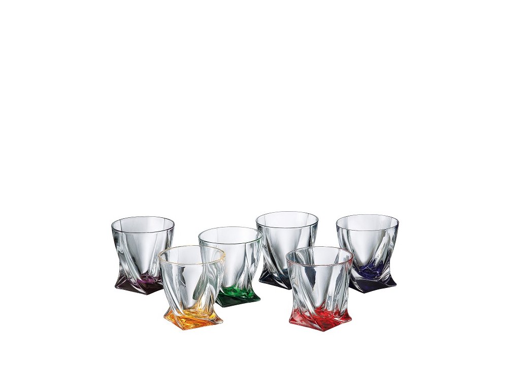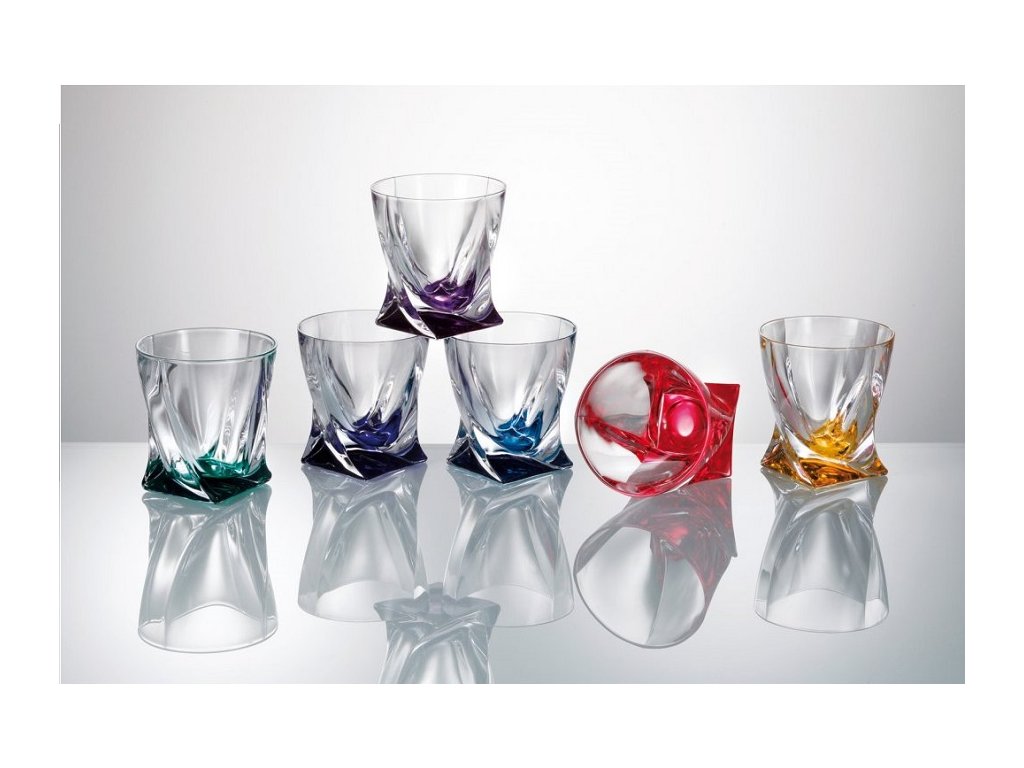Barevné sklenice na whisky nebo vodu z bezolovnatého křišťálového skla. Kromě decentního zabarvení u dna vás sklenice zaujmou svým tvarováním. Točené tělo sklenice vychází ze čtvercového dna a postupně přechází do kruhového ústního okraje. Přestože mají sklenice zabarvené jen dno, tak odlesky při natáčení vyvolávají dojem plnobarevnosti sklenice. Sklenice jsou vyrobeny z ekologicky šetrné skloviny bez sloučenin olova má špičkové parametry srovnatelné s českým křišťálem. Vlastnosti skla zlepšuje příměs titanu, zaručující větší pevnost a odolnost výrobku při vysoké úrovni transparentnosti a brilance skla. Sklenice vyrábí populární česká sklárna Crystalite Bohemia ze Světlé nad Sázavou. Sklenice jsou baleny v tmavomodré krabičce po 6 kusech.