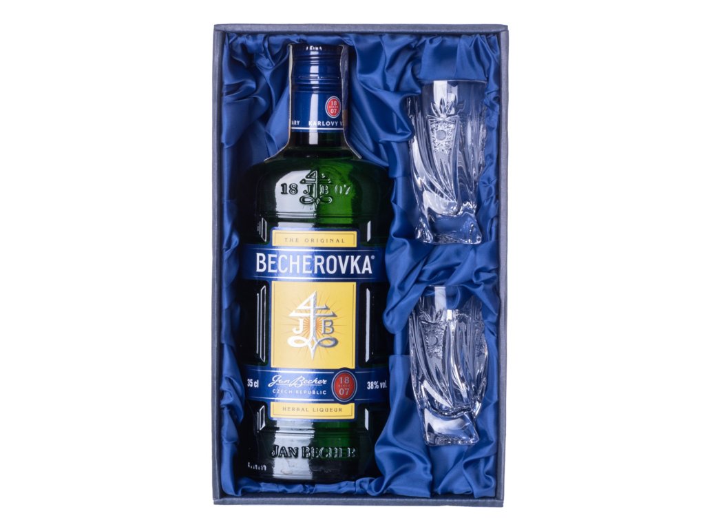 Becherovka v dárkovém balení 0,35l + 2ks. broušených sklenic brus Kometa 50ml