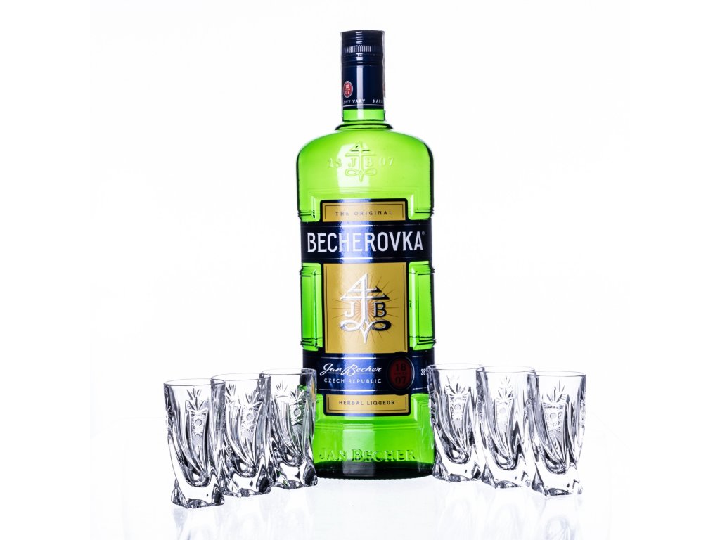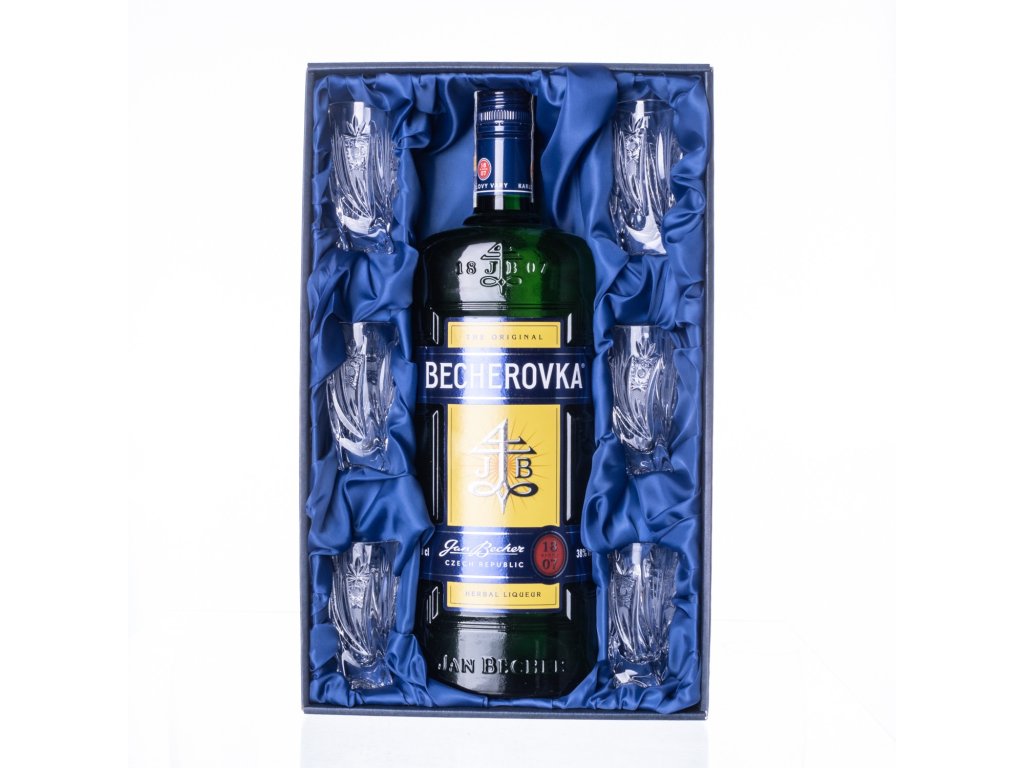 Becherovka v dárkovém balení 1l + 6ks. broušených sklenic brus Kometa 50ml