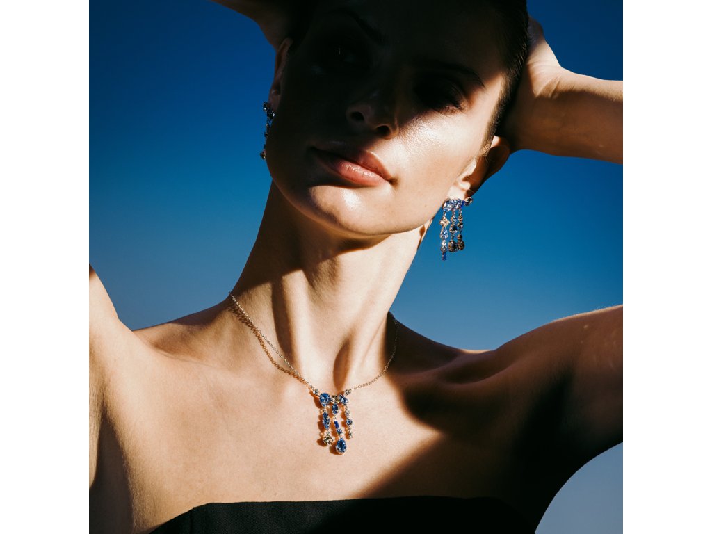 Název Splash v angličtině znamená šplouchnutí nebo rozstříknutí vody – dokonale vystihuje hravý a přitom elegantní charakter tohoto designu. Jako by se modré kapky proměnily v jiskřivé kameny českého křišťálu Preciosa a rozlily se v oslnivém třpytu kolem Vašeho dekoltu.