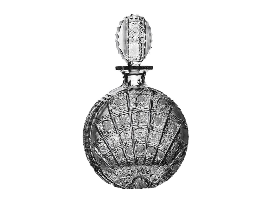 Ručně broušená lahev na whisky, rum apod. z olovnatého křišťálového skla. České olovnaté křišťálové sklo s minimálním obsahem 24% olova, které se vyznačuje vysokou mírou pevnosti, transparentnosti, brilance a třpytu. Výrobek je ručně broušen klasickým brusem 500 PK. Tento bohatý brus vzniká náročným ručním broušením a následně leštěním. Každý kus je originál. Tradiční český sklářský výrobek. Baleno v modré kartonové krabici.