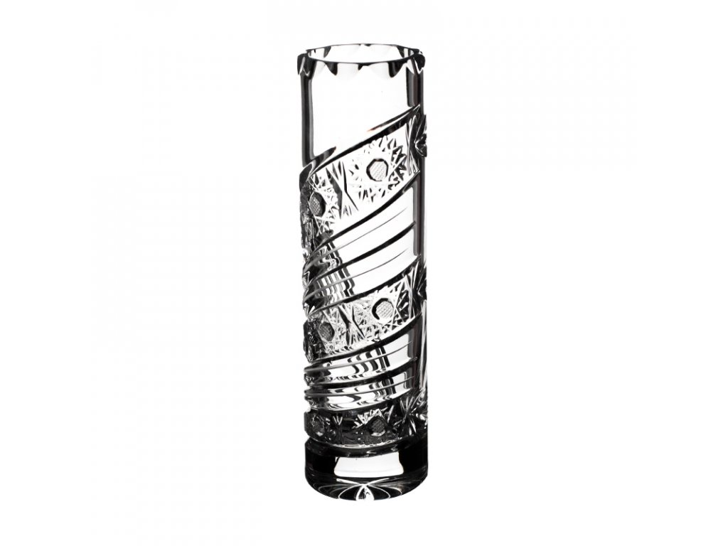 Váza tvar válec. Ručně foukané a broušené sklo. České olovnaté křišťálové sklo 24% Pb. Dekorováno moderním brusem kometa.