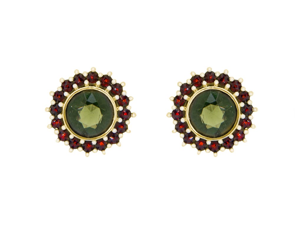 Stříbrné pozlacené náušnice osazené pravými českými granáty a vltavínem. Ke každému šperku přikládáme certifikát pravosti a dárkovou krabičku. Český granát pochází z nalezišť Podsedice a Dolní Olešnice. Český výrobek s nezaměnitelným charakterem. V jednoduchosti je krása. Toto dokonale platí pro elegantní šperky z pravého českého granátu.