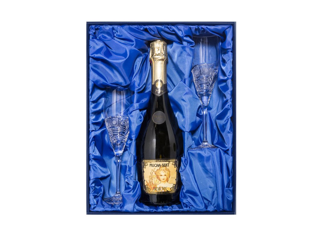 MUCHA SEKT DEMI SEC: nedílnou součástí dárkové sady je MUCHA SEKT DEMI SEC. Tento polosuchý sekt zaujme jemnou vůní biskvitů rozprostřenou na delikátním ovocném pozadí. Ve skleničce vás poté potěší jemná pěna a gejzír bublinek.