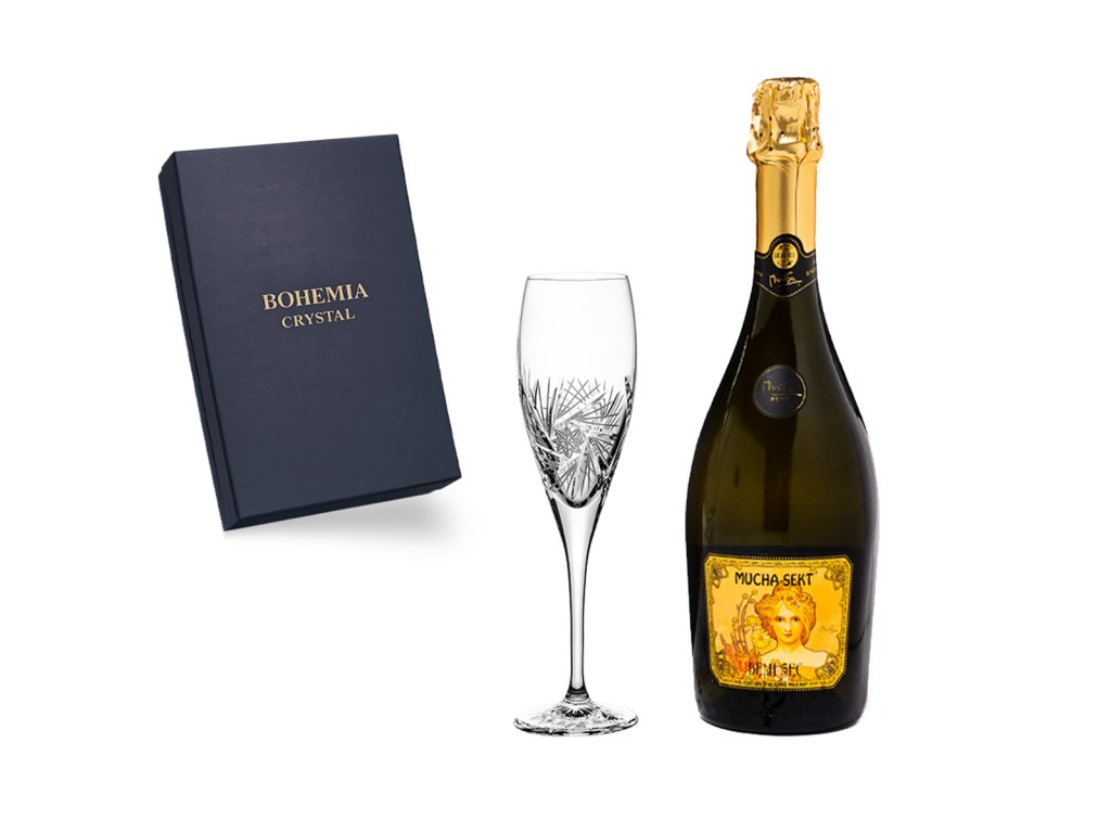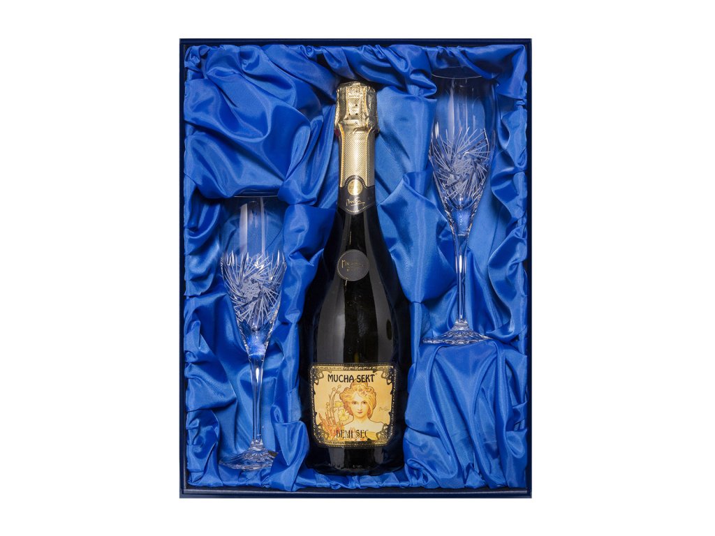 MUCHA SEKT DEMI SEC: nedílnou součástí dárkové sady je MUCHA SEKT DEMI SEC. Tento polosuchý sekt zaujme jemnou vůní biskvitů rozprostřenou na delikátním ovocném pozadí. Ve skleničce vás poté potěší jemná pěna a gejzír bublinek.
