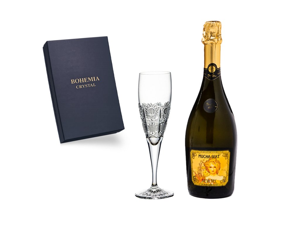 MUCHA SEKT DEMI SEC: nedílnou součástí dárkové sady je MUCHA SEKT DEMI SEC. Tento polosuchý sekt zaujme jemnou vůní biskvitů rozprostřenou na delikátním ovocném pozadí. Ve skleničce vás poté potěší jemná pěna a gejzír bublinek.