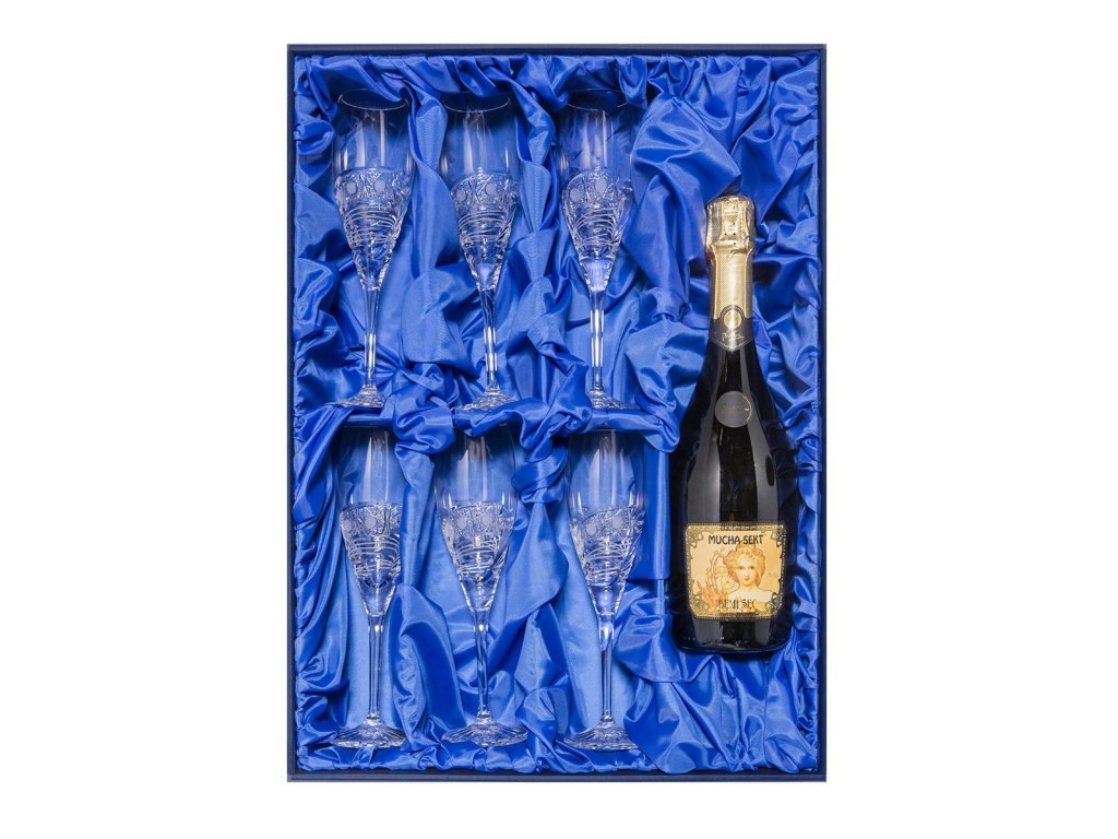 Originální dárková kazeta ručně broušených Bohemia Crystal sklenic na šampaňské společně s Mucha...