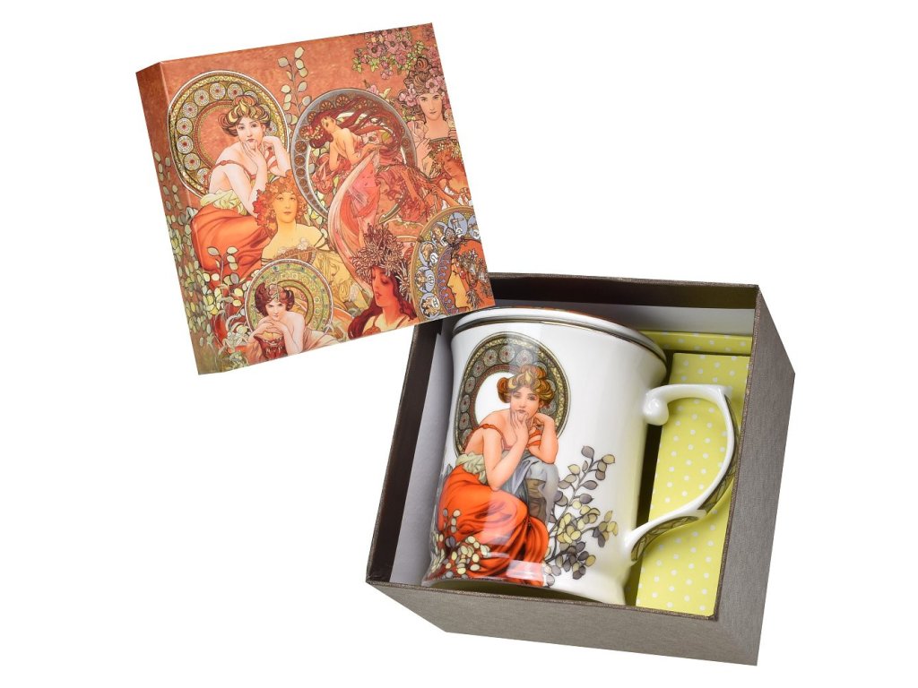 Hrnek s motivem z obrazů malíře Alfonse Muchy. Baleno v dárkové krabičce. Obsah 300ml.
