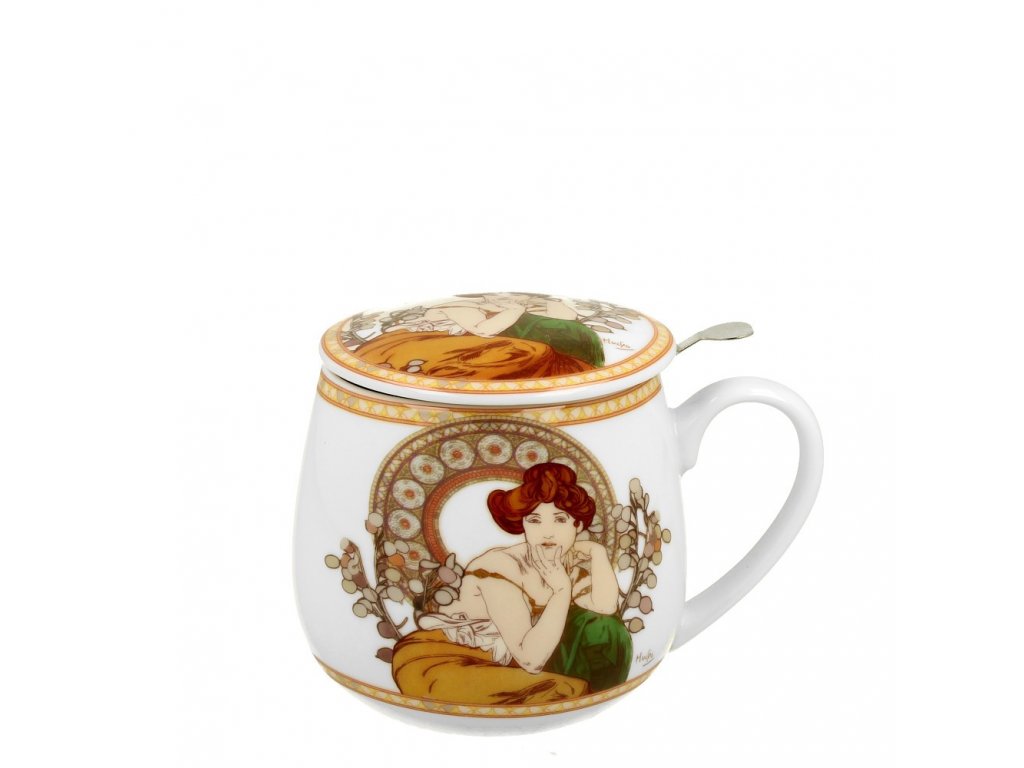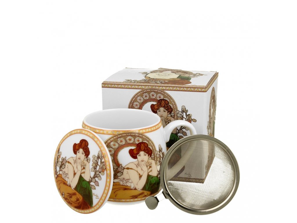 Porcelánový hrnek na bylinky se sítkem a pokličkou s motivem z obrazů našeho světoznámého malíře Alfonse Muchy. Krásný dárek, který potěší, nebo si udělejte sami radost a dopřejte si každý den svůj oblíbený nápoj z krásného hrníčku. Baleno v nádherné ozdobné dárkové krabičce.