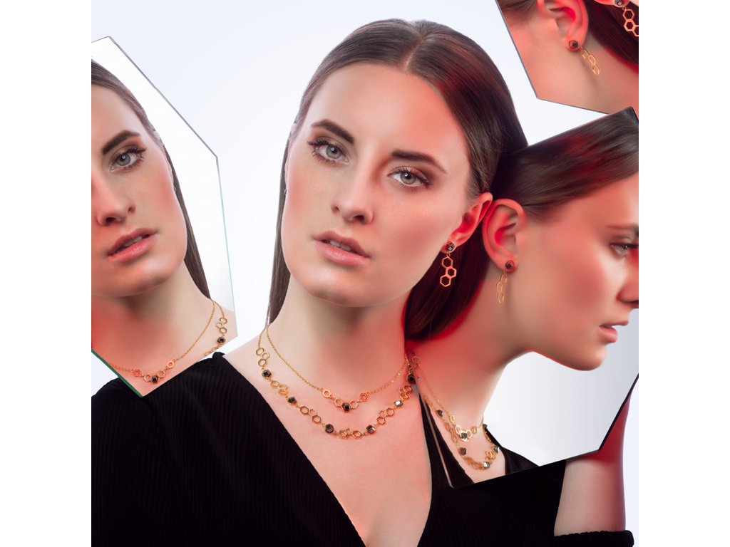Designérka se při jeho navrhování nechala inspirovat dokonalým tvarem medových pláství, který vytvořila příroda. Není proto náhoda, že náhrdelník z chirurgické oceli nese název Honeygon. Tomuto náhrdelníku vévodí tmavý křišťálový kámen, který pro vás skláři v Preciose ručně tvoří nad kahanem technologií pocházející z 18. století. Jemnost šperku z chirurgické oceli dodávají jemné kameny kubické zirkonie zasazené v jednotlivých částech šperku.