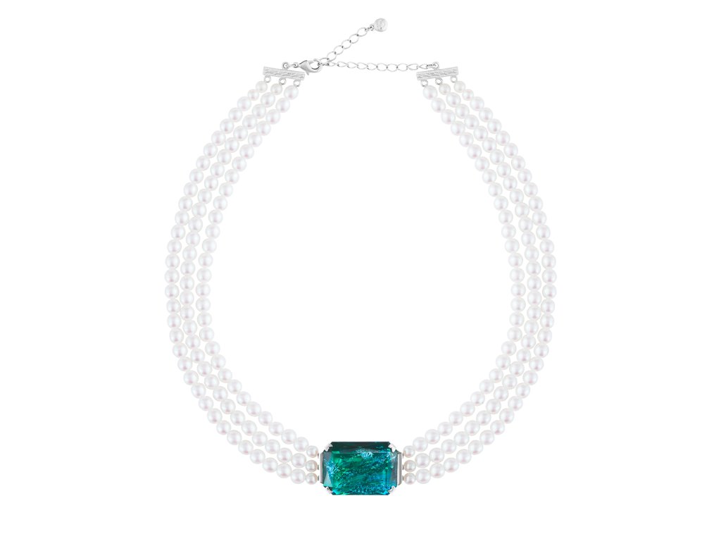Trojřadý perlový náhrdelník s ručně mačkaným křišťálovým kamenem Preciosa je dokonalým ztělesněním elegance a nadčasové sofistikovanosti. Tři jemné řady perlí splétají příběh noblesy, zatímco uprostřed září ručně mačkaný křišťálový kámen Preciosa v hlubokém emeraldovém tónu. Každý kámen je tvořen tradiční technikou mačkání skla nad kahanem, kterou si skláři předávají z generace na generaci. Kámen o rozměrech 34 × 22 mm je navíc obohacen o plátek stříbra. I díky tomu je každý kus jedinečným originálem.