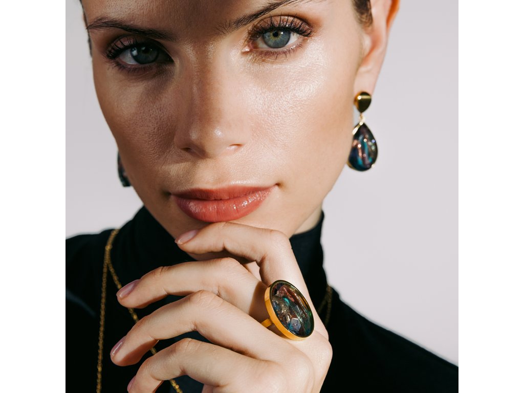 Elegantní pozlacená chirurgická ocel podtrhuje barevnou hru světla v kameni, který pro Vás mačkají skláři v kleštích nad kahanem a zajišťuje dlouhou životnost i komfort při nošení.