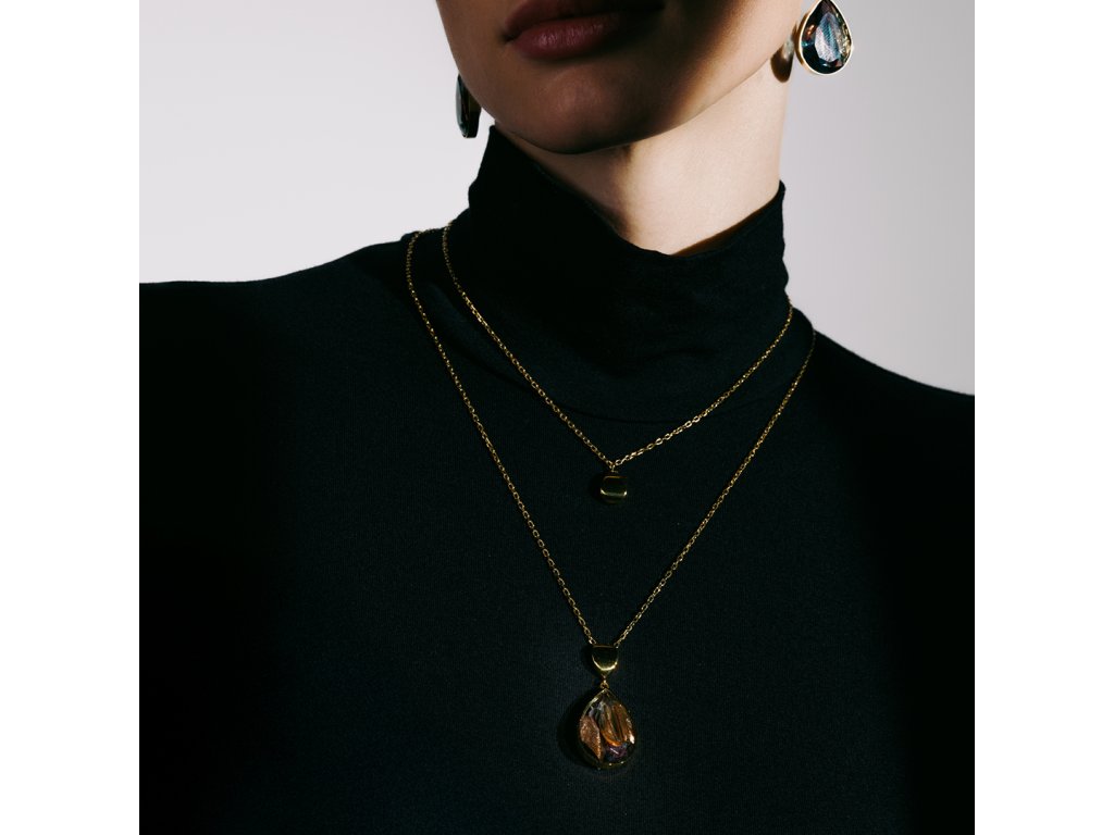 Pozlacený náhrdelník Aurora ve tvaru kapky nese minimalistický tvar, který se hodí ke každému outfitu. Náhrdelník o délce 40 cm je doplněn o 7 cm dlouhou adjustu a umožní tak upravit si délku šperku dle potřeby. Adjusta je navíc dekorována křišťálovým broušeným kamenem Preciosa.