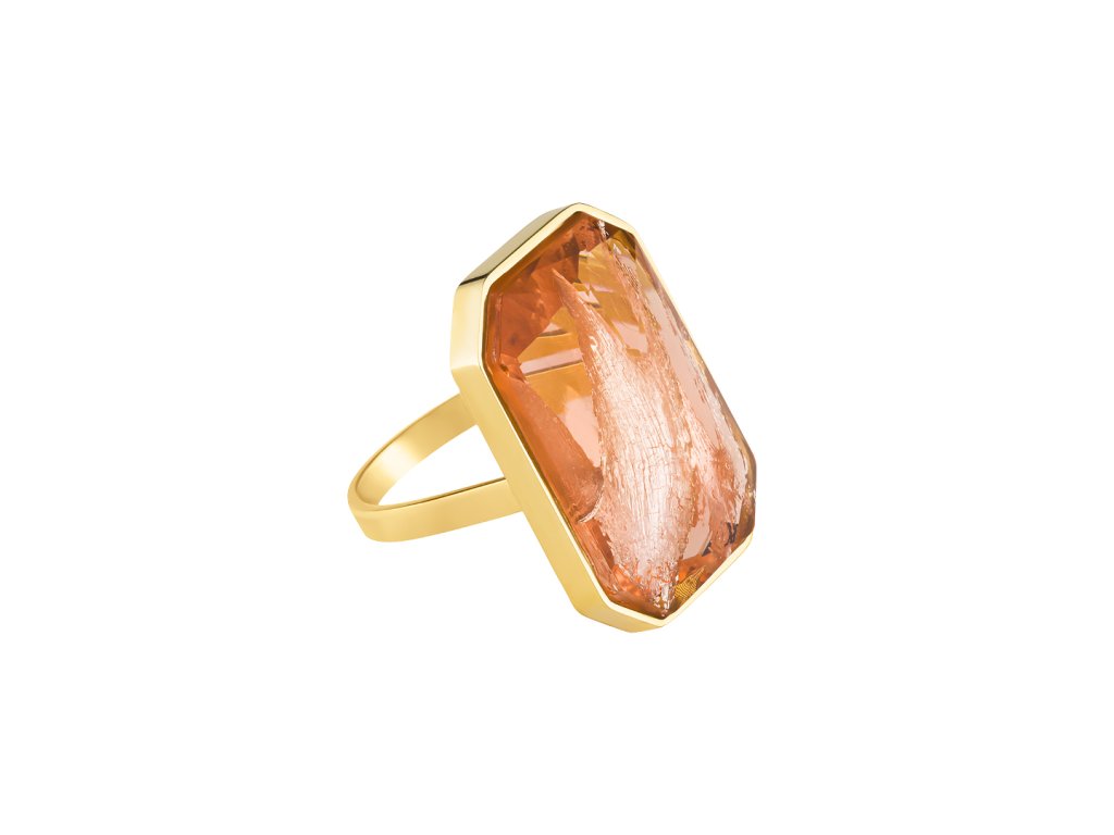 Pozlacený prsten Ocean si rozhodně nehraje na nenápadný doplněk – tenhle kousek chce zazářit! Hlavní hvězdou šperku z chirurgické oceli je ručně mačkaný křišťálový kámen, který vzniká doslova v ohni – skláři ho tvarují kleštěmi nad kahanem, tradiční sklářskou technologií. Každý kus je tak naprostý originál. Uvnitř kamene se navíc blyští plátek pravého stříbra.
