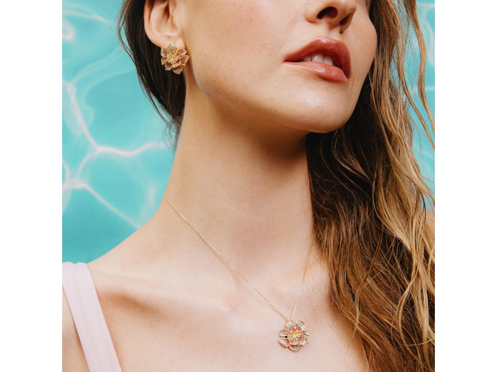 Luxusní pozlacený náhrdelník Mirage působí jako z pohádky – září, třpytí se a nikdy neuvadne. Pozlacený šperk ve tvaru rozkvetlého květu je posetý záplavou kamenů kubické zirkonie, které se vyjímají na okvětních lístcích. Je něžný, ale zároveň nepřehlédnutelný. Tato květinová inspirace vnese do Vašeho dne špetku kouzla a nadmíru luxusu. Název Mirage znamená v překladu „něco neskutečného“, odkazuje na iluzi dokonalosti a krásy – jako když se Vám v dálce zjeví sen, který chcete za každou cenu chytit. Tento šperk je právě takový – jen s tím rozdílem, že ho můžete opravdu nosit.