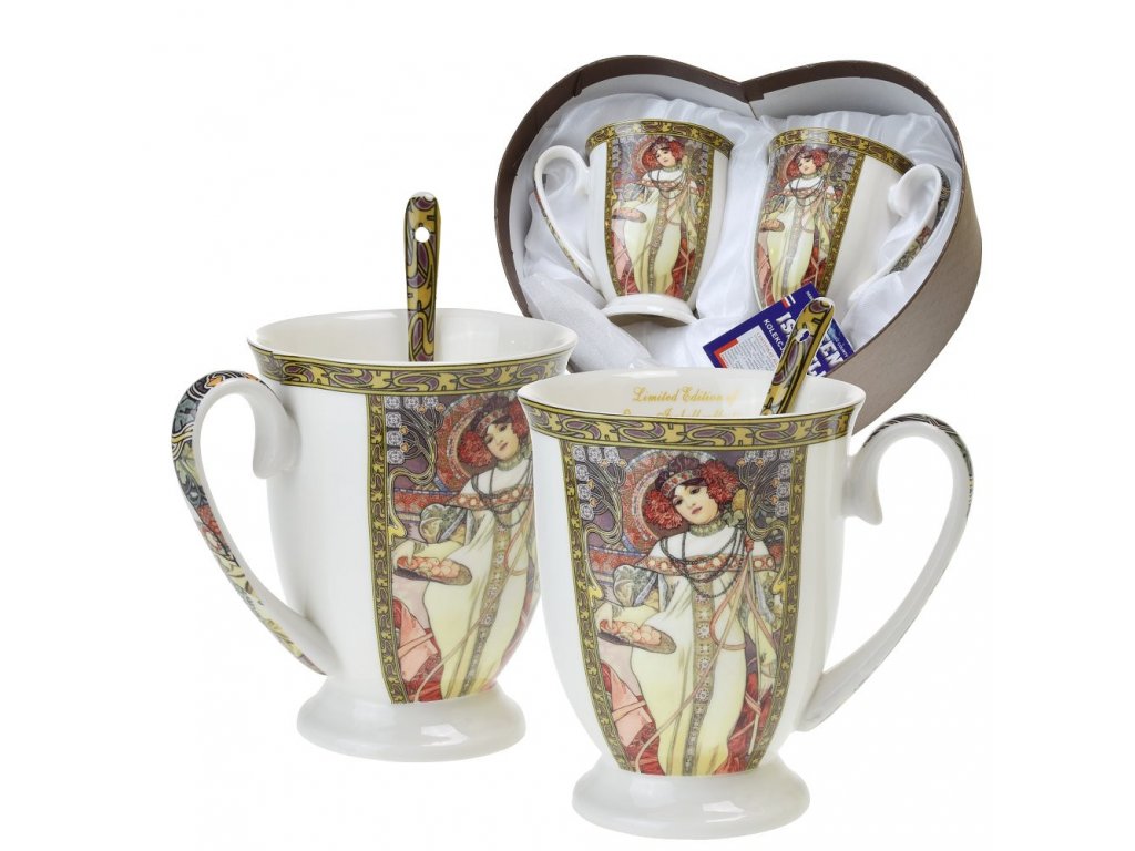 Přátelská souprava dvou hrníčků a lžiček s motivem z obrazů našeho světoznámého malíře Alfonse Muchy. Krásný dárek, který potěší, nebo si udělejte sami radost a dopřejte si každý den svůj oblíbený nápoj z krásného hrníčku. Baleno v nádherné ozdobné dárkové krabičce ve tvaru srdce.