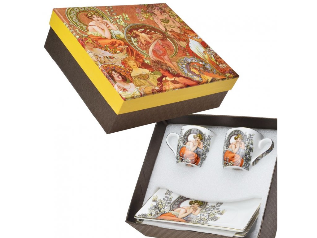 Přátelská souprava dvou šálků s podšálky s motivem z obrazů našeho světoznámého malíře Alfonse Muchy. Krásný dárek, který potěší, nebo si udělejte sami radost a dopřejte si každý den svůj oblíbený nápoj z krásného hrníčku. Baleno v nádherné ozdobné dárkové krabičce.