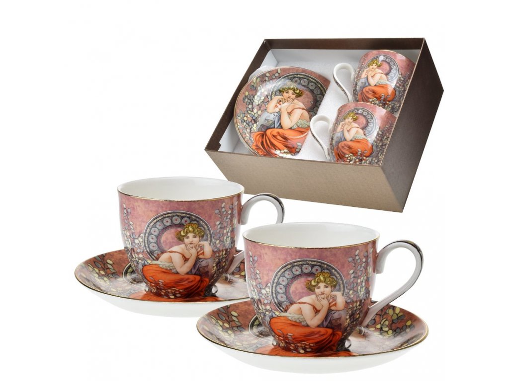 Přátelská souprava dvou šálků s podšálky s motivem z obrazů našeho světoznámého malíře Alfonse Muchy. Krásný dárek, který potěší, nebo si udělejte sami radost a dopřejte si každý den svůj oblíbený nápoj z krásného hrníčku. Baleno v nádherné ozdobné dárkové krabičce.