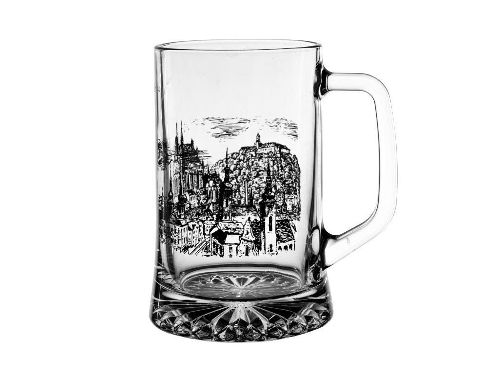 Pivní sklenice s motivem Brna. Objem sklenice 0,5l. Klasický půllitr s černou perokresbou.
