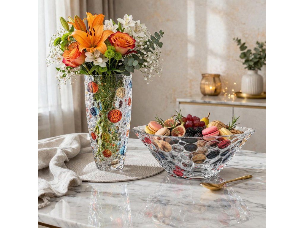 Skleněná váza na květiny Lisboa zaujme na první pohled svou dekorací. Pestrobarevné bubliny jsou po celém objemu této vázy navženy tak, že z ní dělají krásnou ozdobu každého interiéru.