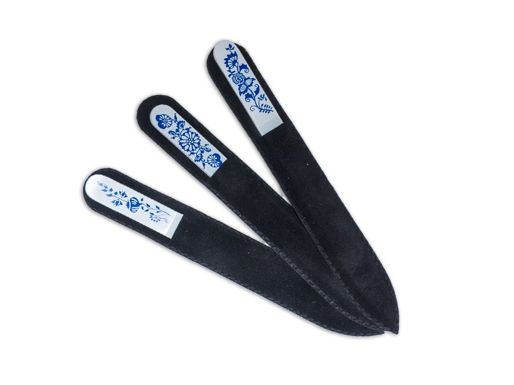 Elegantní skleněné pilníky na nehty jsou vyrobeny v České republice z českého tvrzeného skla. Na brusnou plochu pilníku poskytujeme doživotní záruku. Pilníky jsou ručně dekorovány vzorem cibulák. Každý kus je originál a dekorace u každého pilníku se mírně odlišuje. Pilníky mají oboustrannou pilovací plochu a jsou dodávány v elegantním sametovém obalu, takže se skvěle hodí do vaší kabelky.