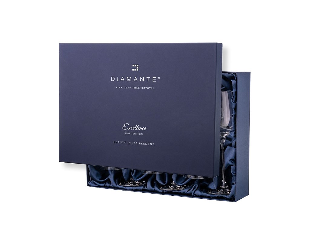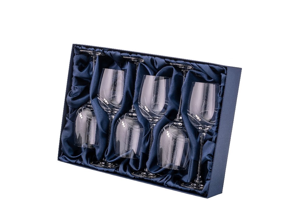 Sada šesti sklenic na víno. Ručně vybroušený lehký moderní dekor a zdobeno třemi Swarovski krystaly. V současné době velmi oblíbený a krásný dárek. Sklenice jsou vyrobené z kvalitního bezolovnatého křišťálu, a to bez jediného švu. Výrobce myslel i na uživatelsky příjemný zabroušený okraj kalíšku. A kdo nerad balí dárky, toho potěší, že je sada již zabalená v designové krabičce. Sklenice doporučujeme umývat v ruce.