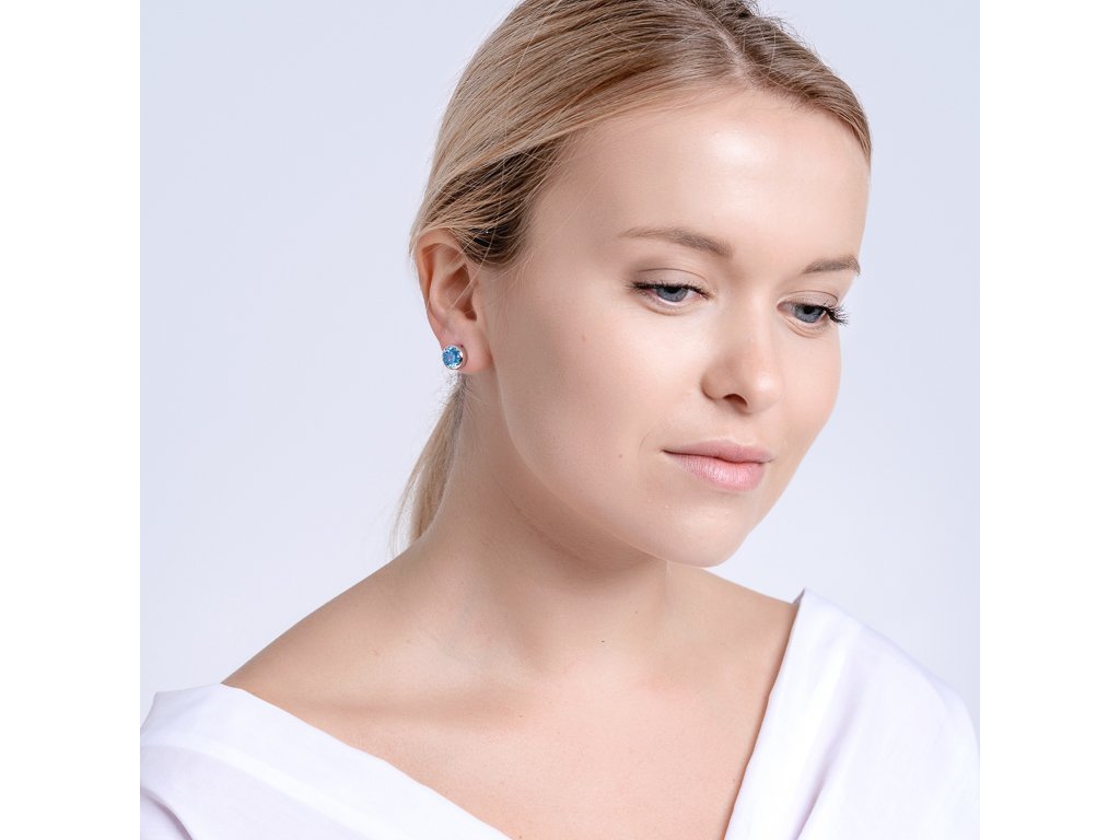 Stříbrné náušnice Vela vynikají svým azurově modrým kamenem zasazeným do stylového rhodiovaného stříbra. Na uchu sedí perfektně díky svému puzetovému zapínání. Díky své velikosti tento šperk ocení i ženy, které se rády zdobí i při sportu.